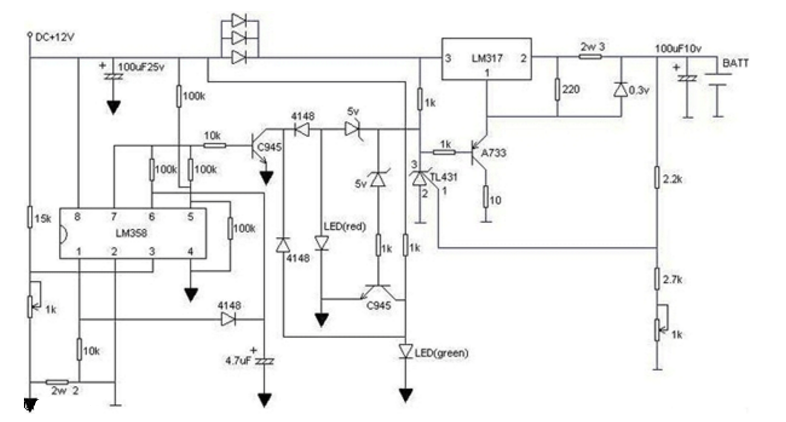 本電路帶充電狀態(tài)顯示功能,紅燈閃正在充,綠燈閃馬上要充滿,綠燈亮完全充滿。只要您有12V的電源就可以,接完電路后先別裝電池,調(diào)右下角的可調(diào)電阻,使電池輸出端為4.2V,再調(diào)左下角的可調(diào)電阻使LM358第三腳為0.16V就可以了,充電電流為380mA,超快,三個(gè)并連的二極管是降壓的,防止LM317過熱,且LM317須加散熱片,圖中的三極管可以任意型號(hào)。